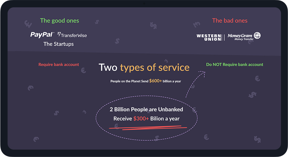 The majority of the unbanked rely on relatives that work abroad and send them money to survive. These transactions are known as remittances. A 650 billion dollar market without any good solutions to the problem. You simply cannot send money internationally in any civilized way that doesn’t take months or costs an arm and a leg for these people who are already very poor.