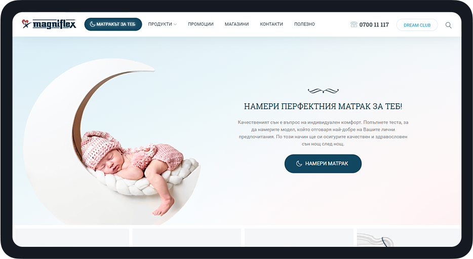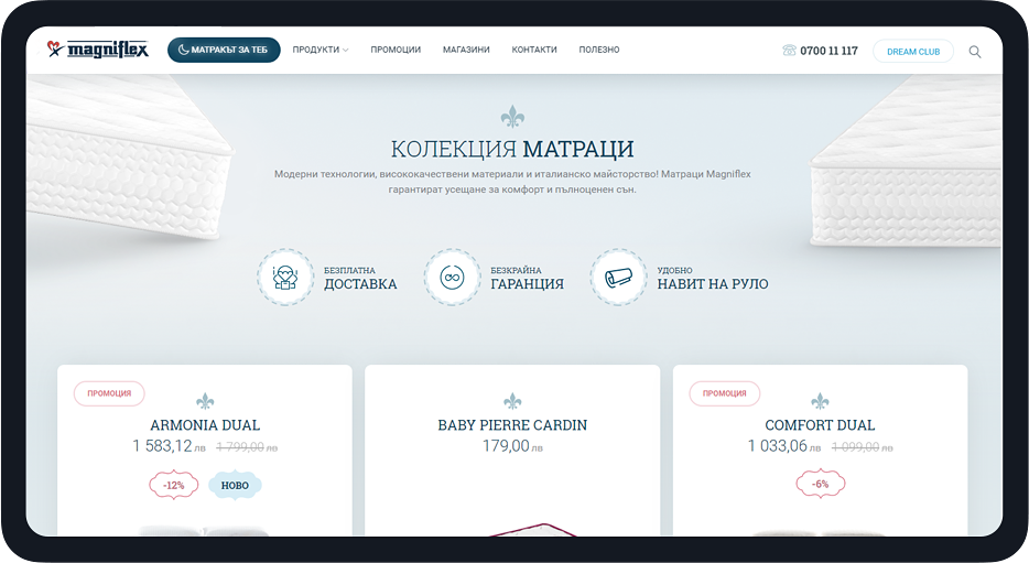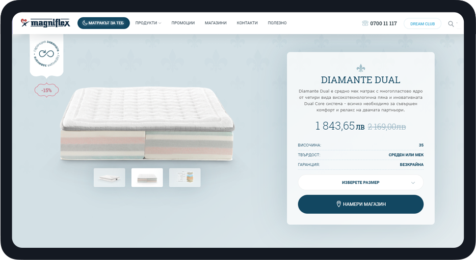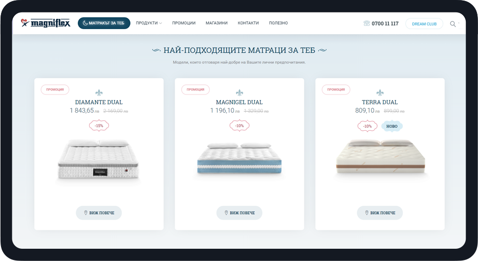 After a lot of hard work and constant communication with the client, we managed to create on of the best mattress eCommerce platforms in Bulgaria and Romania, presenting the No1 Italian mattress brand in the manner that it deserves. We also succeeded in educating and guiding current and future Magniflex customers in choosing the perfect new mattress for them.